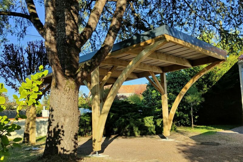 Un carport en bois traité autoclave avec couverture en bac acier gris anthracite.