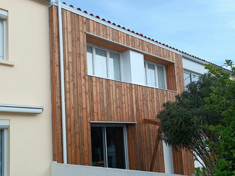 La finition extérieure est en bardage bois vertical douglas, profil Mélodik.